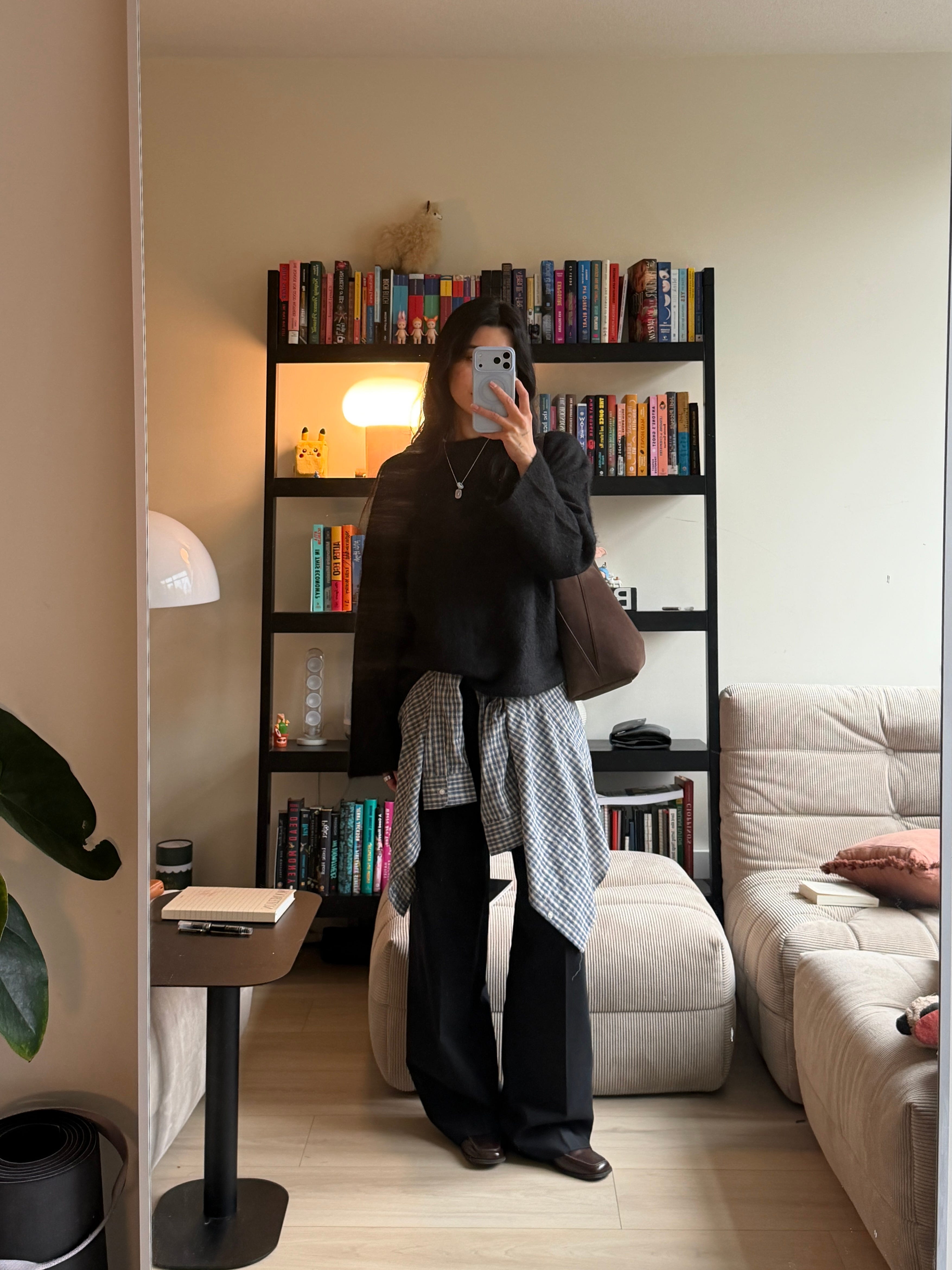 planned so I opted for an easy and comfortable outfit. It has a similar formula to the 04 outfit (black top, plaid shirt, black pants, loafers) but I think the relaxed trousers and alpaca sweater really softens the look.I also tried to break up the chunks of black with a soft brown suede bag and some brown loafers. I’ll always love the black and brown combo no matter who says it doesn’t work.