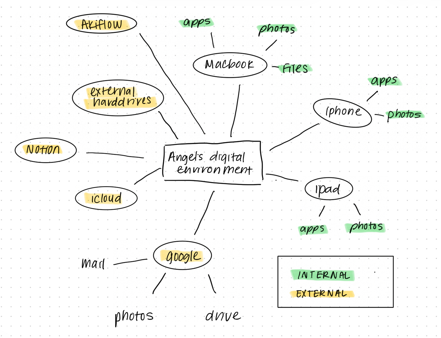 Then “externally” I have hard drives, iCloud storage, Google storage (which includes Google Photos, Gmail, and Google Drive), as well as apps like Notion and Akiflow which hold files and entries as well. I also use Obsidian as a knowledge database but I cleaned that out recently so it’s been excluded here.