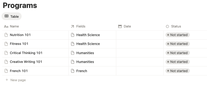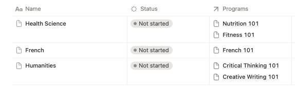 Once you have your field of studies chosen, you can then start building out your programs. The programs are where you get a little more specific about what you’re hoping to learn. Under Health Sciences, I want to learn more about nutrition and fitness so my programs would be Nutrition 101 and Fitness 101. In the future I want to add in Mind-Body Health 101 so I’ll also save that as an elective.