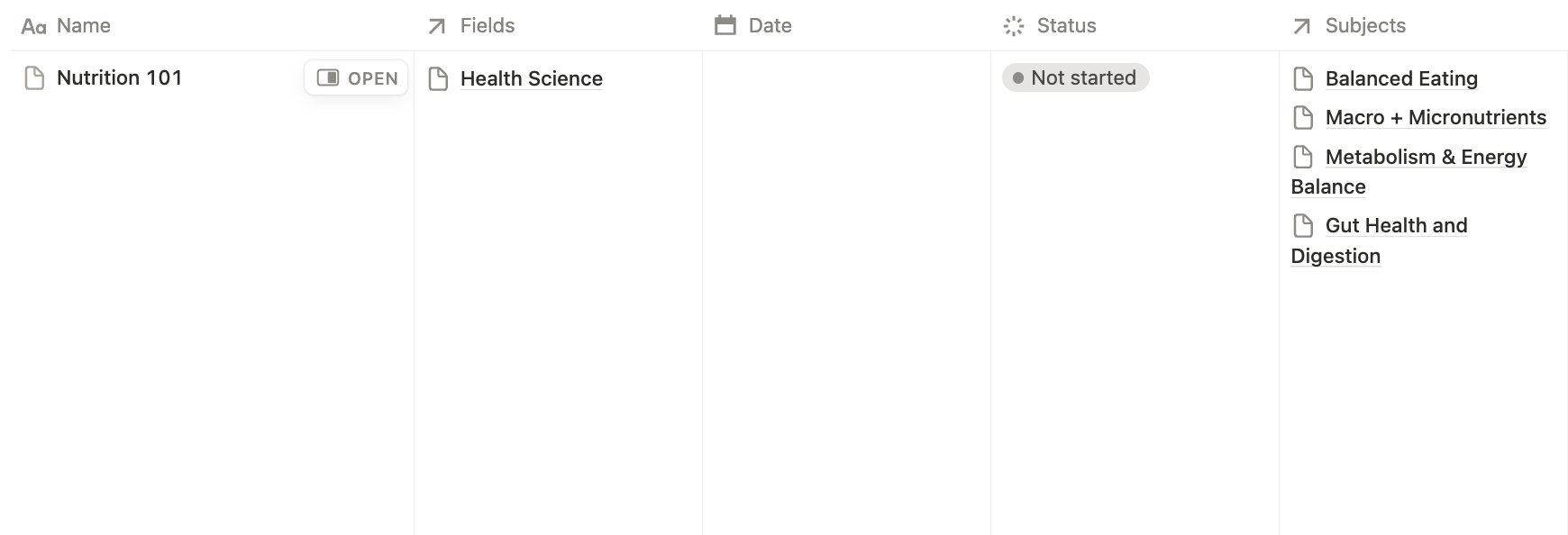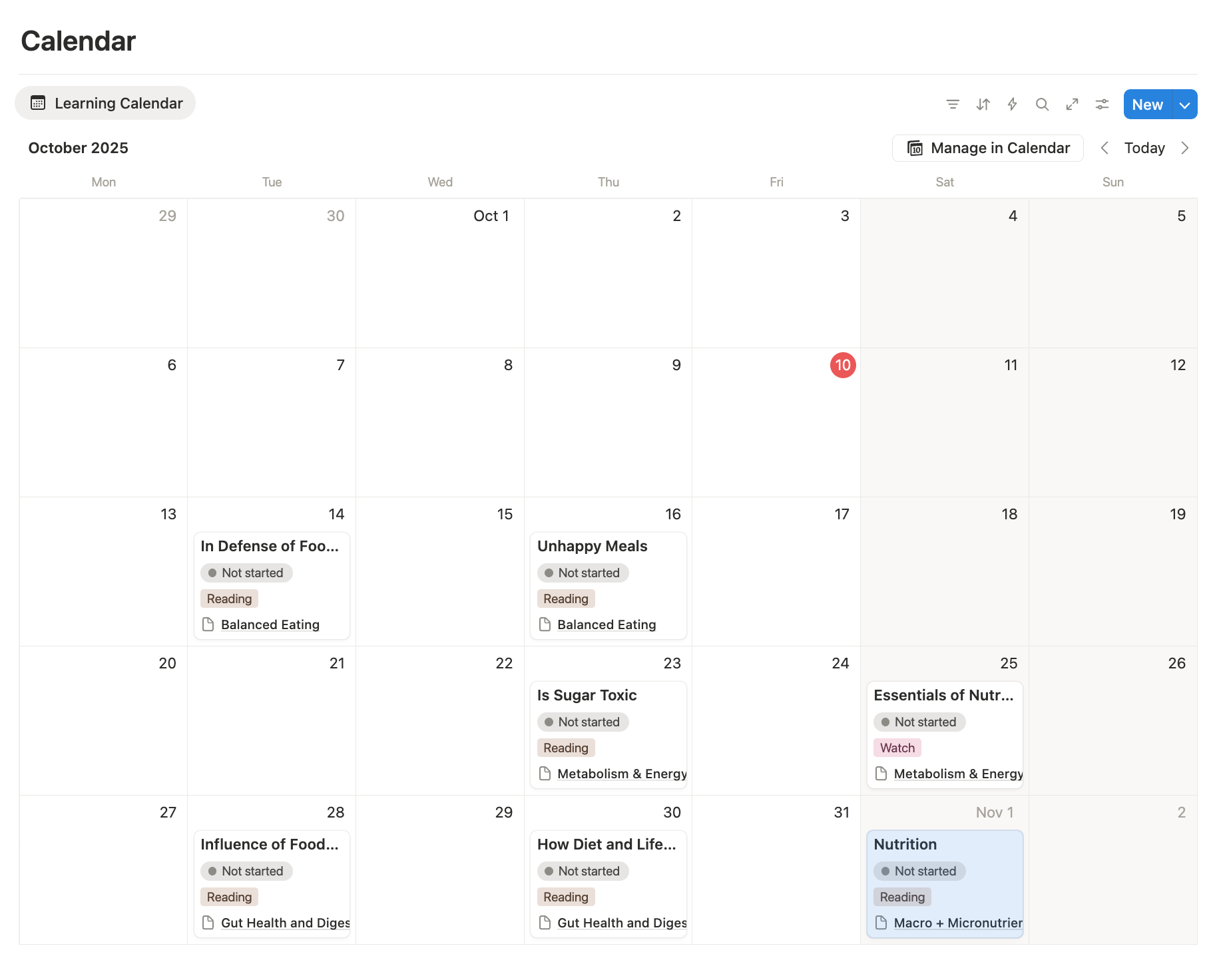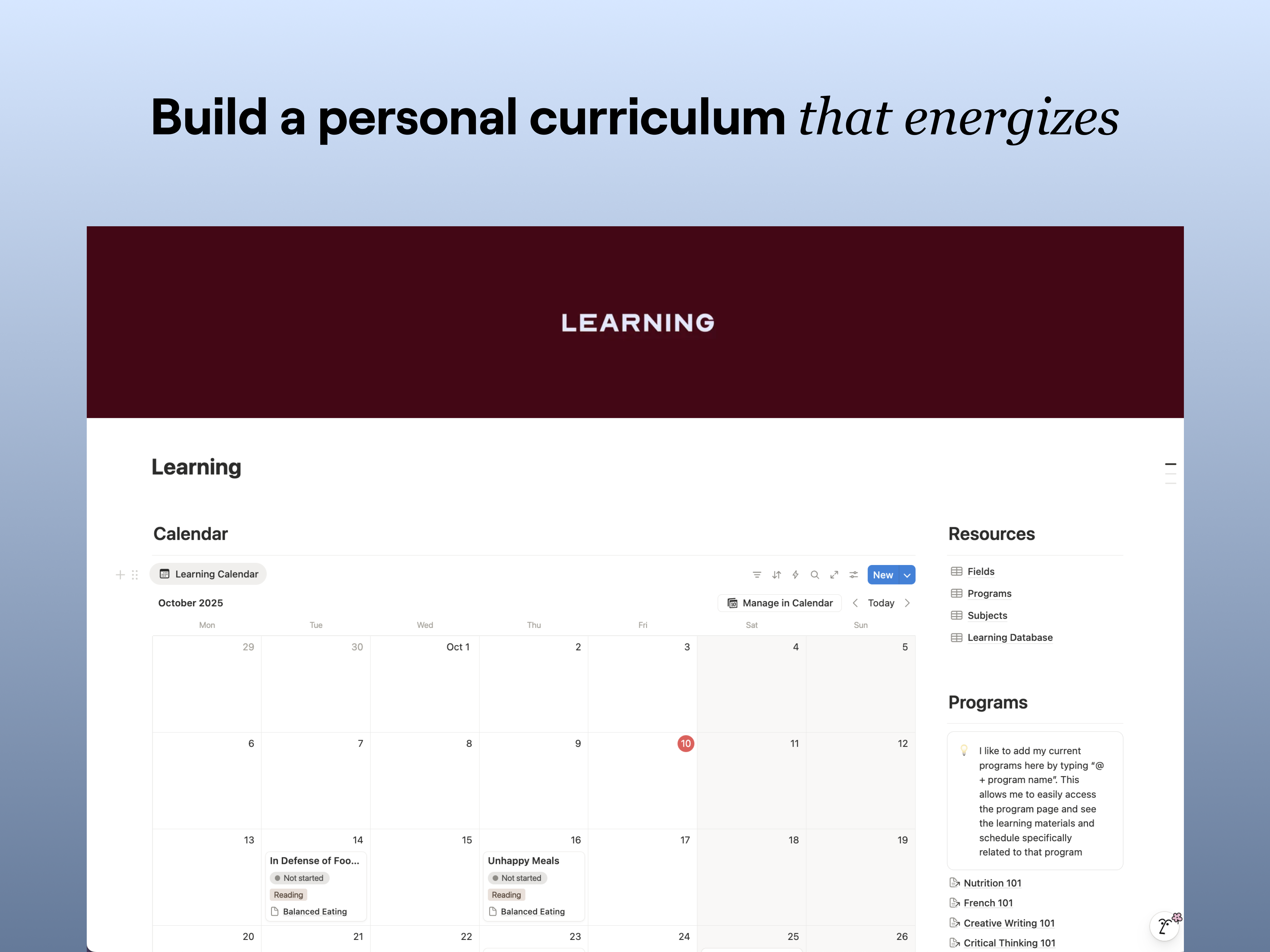 Once I’ve gathered a mix of materials, I do a quick “curiosity test.” I’ll open each one for five minutes and notice how my brain reacts: do I feel energized, bored, confused, or inspired? If it feels like pulling teeth, I move on. If it feels like a conversation I want to keep having, it earns a spot in my curriculum. I store everything in a Notion database organized by field and format — books, essays, videos — so I can easily rotate through mediums depending on my mood or energy level.