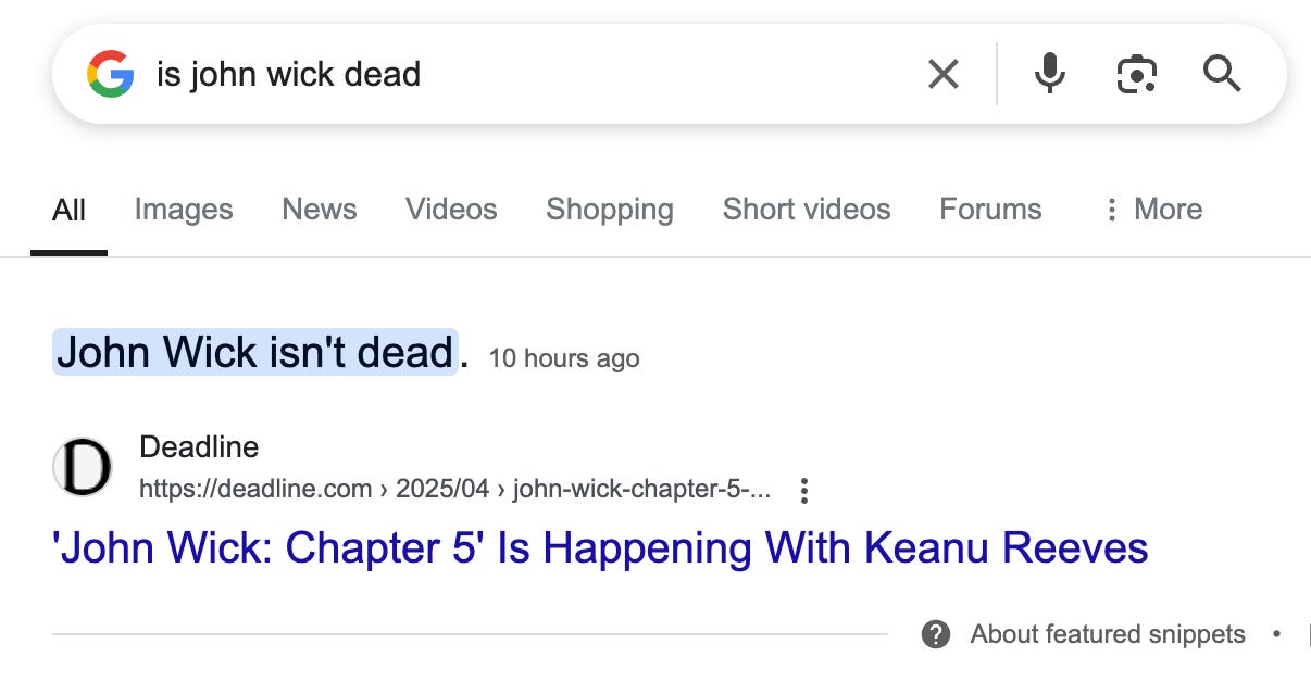 Spoiler! If anyone cares. But this was what I had to search after John Wick. I thought Google’s answer was hilarious. Straight to the point.